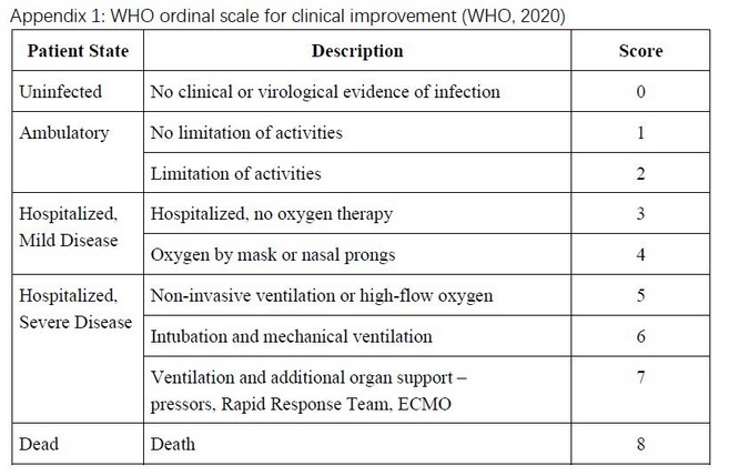 對於藥物治療住院的重症患者,進行療效評估時,FDA及其他主要監管部門均要求觀察重要的臨床獲益指標,這些患者治療後28天內病情惡化(Clinical Deterioration)比例,是公認的最佳療效評估指標之一。NOVATION-1研究主要設計如下:入組的重症患者(WHO量化評分4分或5分)隨機分組後,分別接受霧化吸入樂複能(20μg/次,每天2次,總用藥量40μg/天)或安慰劑治療10天,觀察28天內患者的安全性與初步有效性指標,並在治療結束後2周和4周各隨訪1次。本研究主要療效終點采用WHO量表作為評價標準,評價治療開始至28天內患者的臨床惡化率比例(Proportion of Clinical Deterioration up to Day 28),臨床惡化定義為開始治療第1天至28天內,任一時間病情惡化達到WHO評分6、7或8分(分別對應需要有創性機械通氣、ECMO或死亡,統稱為“呼吸衰竭和死亡”(RespiratoryFailure and Death)。WHO量化評分表(WHO 8-Points Ordinal Scale)參見附件1。