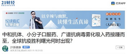 21財經:中和抗體、小分子口服藥、廣譜抗病毒霧化吸入藥接踵而至,全球抗疫勝利曙光何時出現?