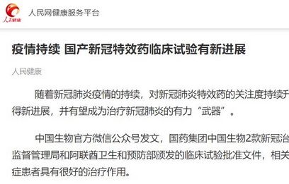 人民健康:疫情持續 國產新冠特效藥臨床試驗有新進展