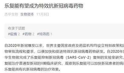 日前,傑華生物官網發文稱,傑華生物正在開展治療新冠的多個國際III期臨床試驗,旗下產品——我國1.1類生物新藥樂複能有望成為特效抗新冠病毒藥物。該公告稱,自2020年新冠流行開始,傑華生物在國內完成了樂複能抑製新冠病毒複製的實驗室研究,以及霧化吸入樂複能治療普通型新冠的II期臨床研究,觀察到樂複能可以加快新冠患者的病毒清除,初步證明樂複能具有抗新冠病毒的治療效果。
