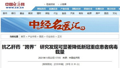 中國經濟網:抗乙肝藥“跨界” 研究發現可顯著降低新冠重症患者病毒載量